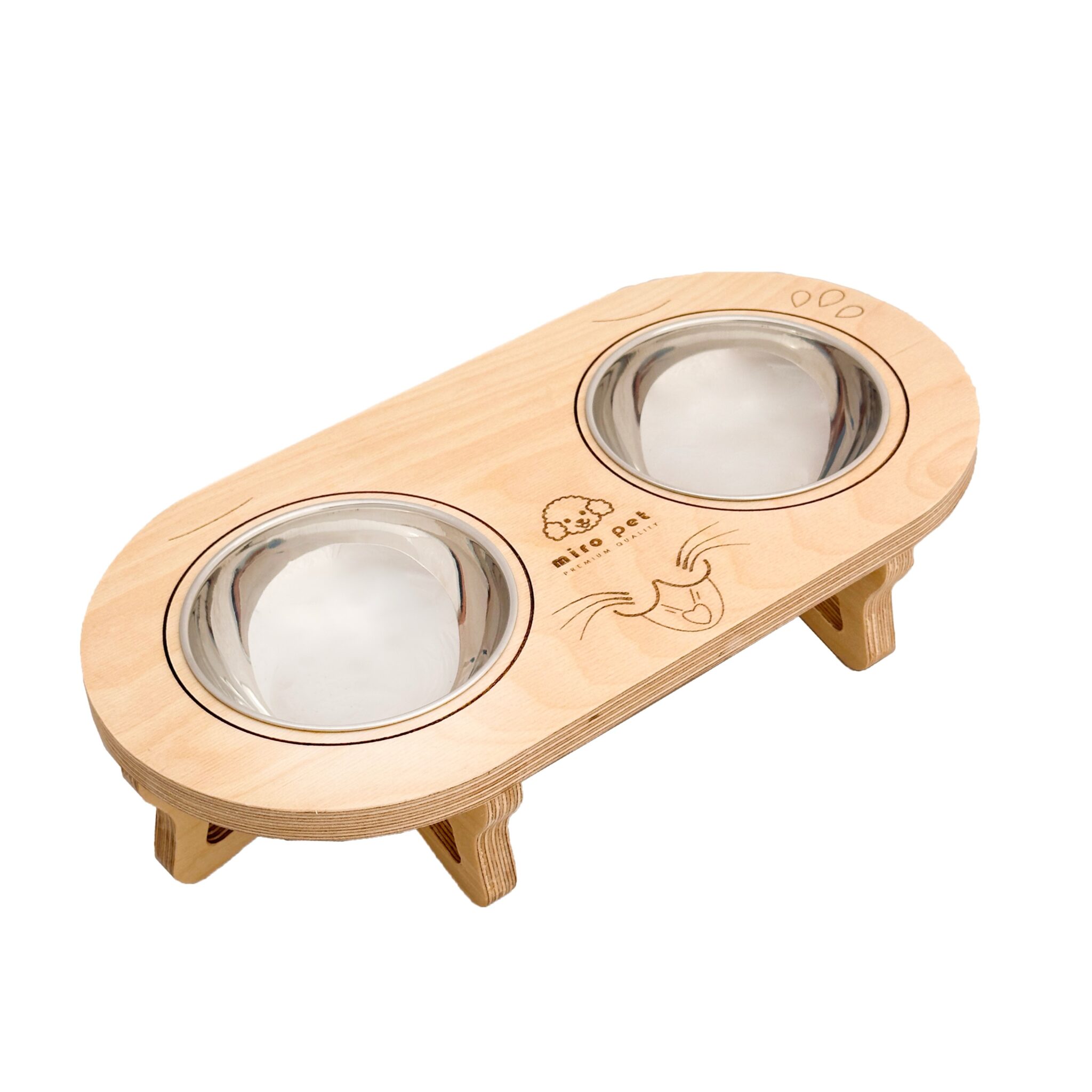 این ظرف شامل دو کاسه استیل ضد زنگ با کیفیت بسیار بالا است که ضد حساسیت بوده، قابلیت جداسازی دارند و به راحتی قابل شستوشو هستند. پایه چوبی آن با روکشی محافظ طراحی شده تا هم از تماس ظرف با سطح زمین جلوگیری کند و هم مانع لغزش آن در حین استفاده شود. ارتفاع استاندارد این ظرف کمک میکند تا حیوانات خانگی بدون فشار به گردن و ستون فقرات، غذای خود را میل کنند که این ویژگی برای گربهها و سگهای نژاد کوچک، بهخصوص در سنین بالا، بسیار حیاتی است.