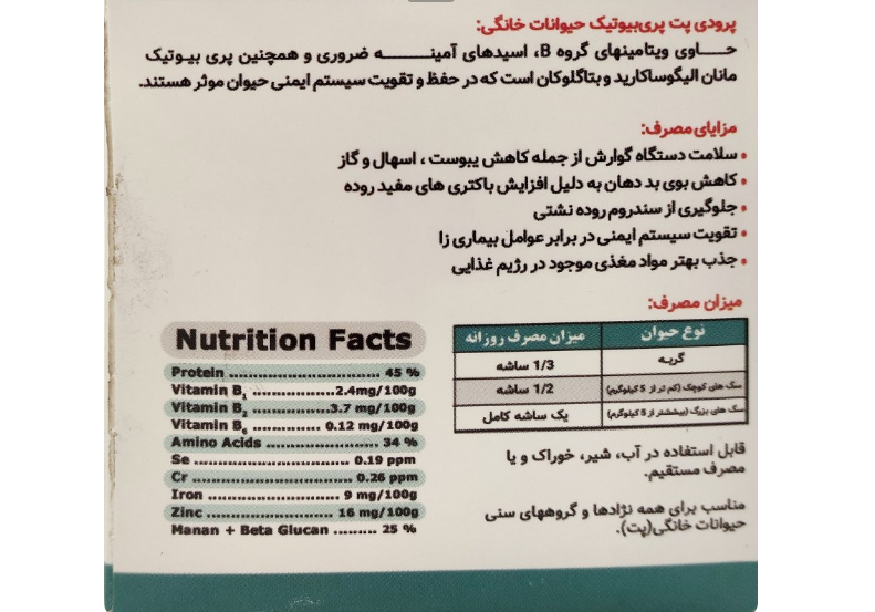 پرودی پت شامل ویتامین های گروه B و اسید آمینه های ضروری بدن حیوانات می باشد. و همچنین داریی مانانالیگوساکارید و بتاگلوکان به عنوان پری بیوتیک است که در تقویت سیستم ایمنی بدن حیوان موثر هستند.
